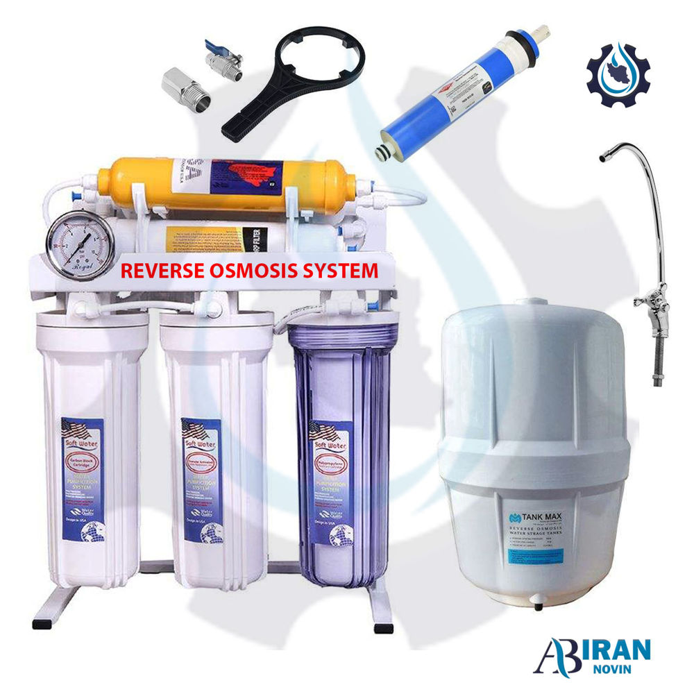 منبع ذخیره آب : به دلیل اینکه روزنه های فیلتر ممبران بسیار کوچک هستند ، آب به حالت قطره ای از آن خارج میشود. بنابراین دستگاه نیاز به یک منبع برای ذخیره سازی آب دارد تا بتوان آب را با حجم بالا از دستگاه دریافت کرد