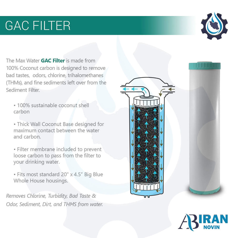 این فیلتر از کربن فعال دانه ای تشکیل شده ، که با حذف کلر و برخی ازآلاینده های شیمیایی نظیر : تری هالومتان ، به ازبین بردن رنگ ، بو و طعم نامناسب آب کمک میکند.